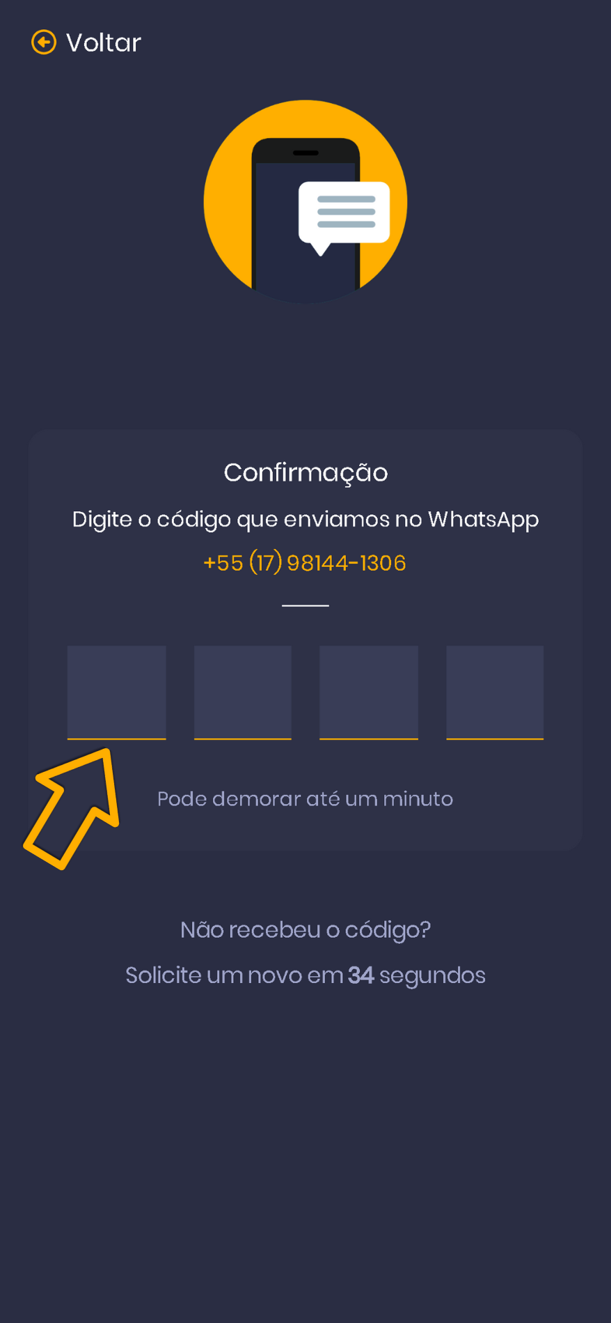 3. Você receberá um código de verificação de 4 dígitos no seu WhatsApp, insira ele no app. Você será automaticamente redirecionado para o espaço do estabelecimento.