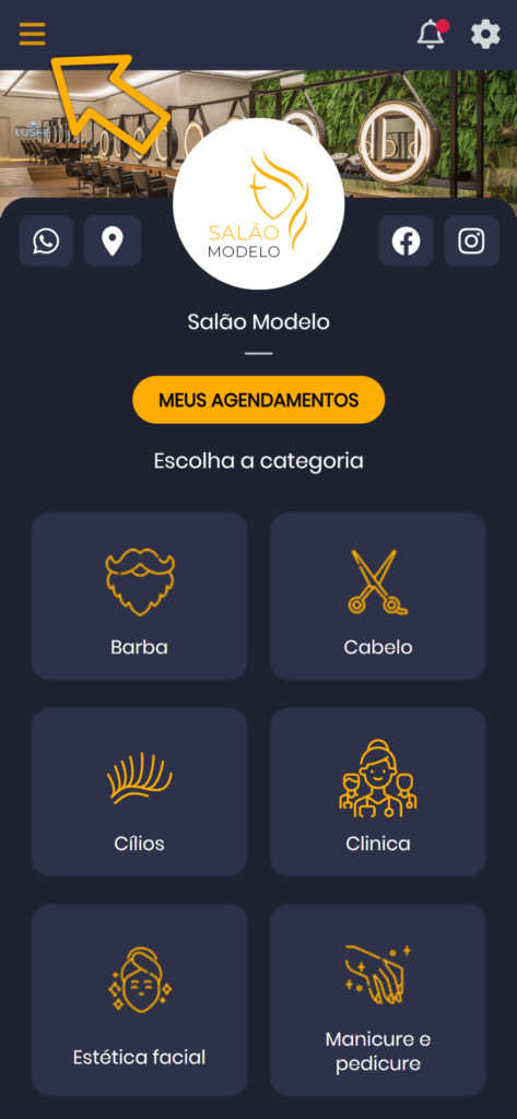 1. Clique no link de acesso recebido pelo WhatsApp de seu profissional, você será encaminhado para a pagina inicial do App. Em seguida clique no “Menu Principal”.